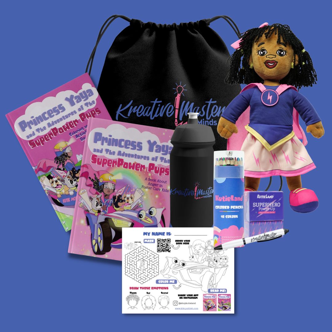 This bundle is great for young writers. In this, you are given a Guided Journal and Worbook, Princess Yaya or King James Plushie, Princess Yaya and the Super Pups coloring activity book, folder, affirmation cards , water bottle, color pencils, worksheets and Kreative Masterminds book bag
